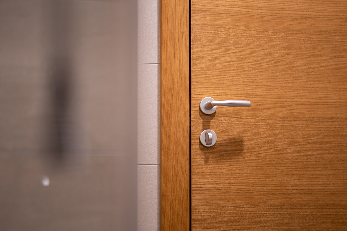 Sva sobna vrata su u istom dezenu, odnosno horizontalno postavljenom funiru bajcovanog hrasta, sa svedenim, pravougaonim L2 pervajzima. Pervajzi su, kao što BOSAL uvek i preoručuje, bez gera, to jest nisu spojeni pod uglom od 45 stepeni, već pod uglom od 90 stepeni, a oni su na pojedinim mestima i ukrajani, kako bi se dobila maksimalna širina otvora.
