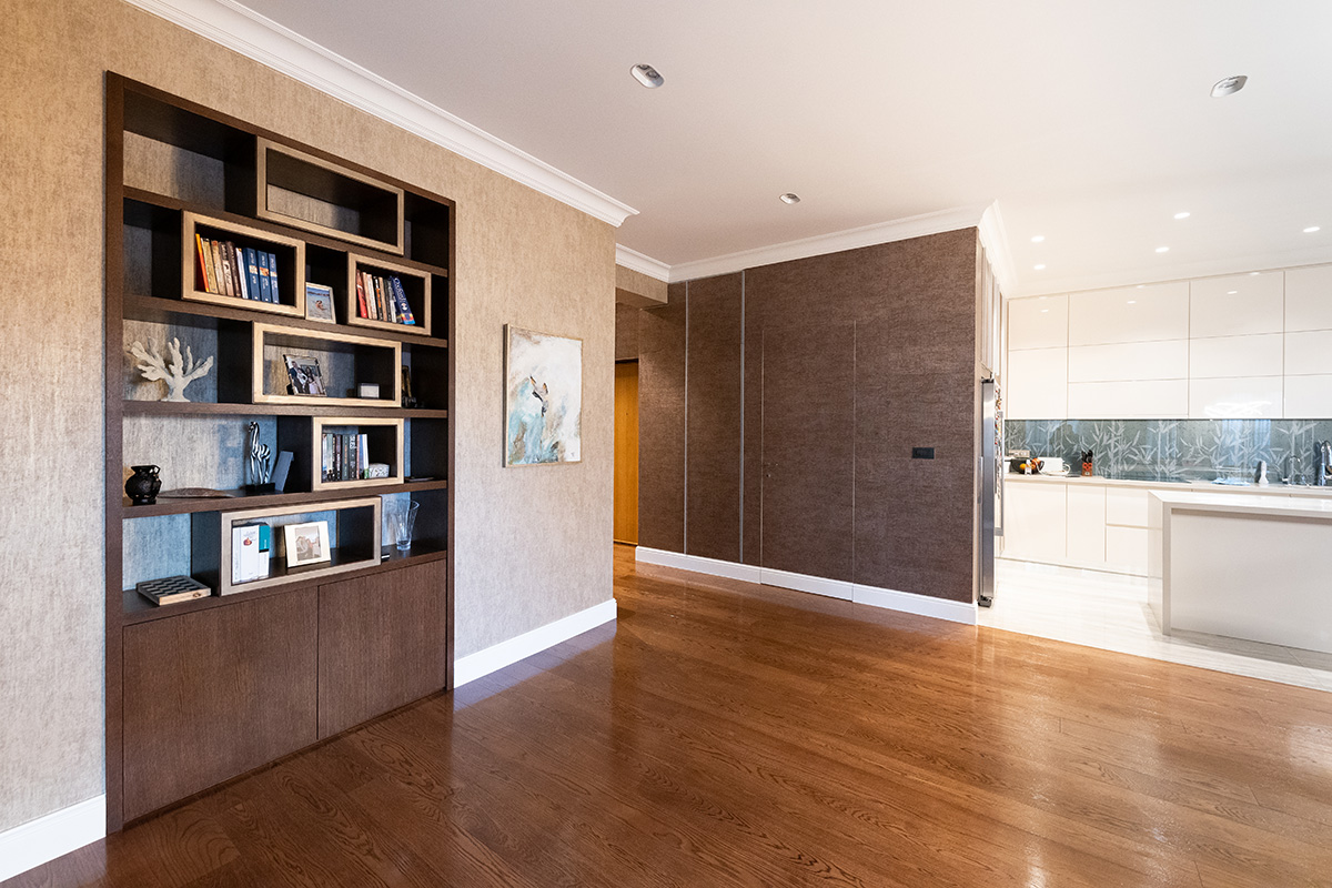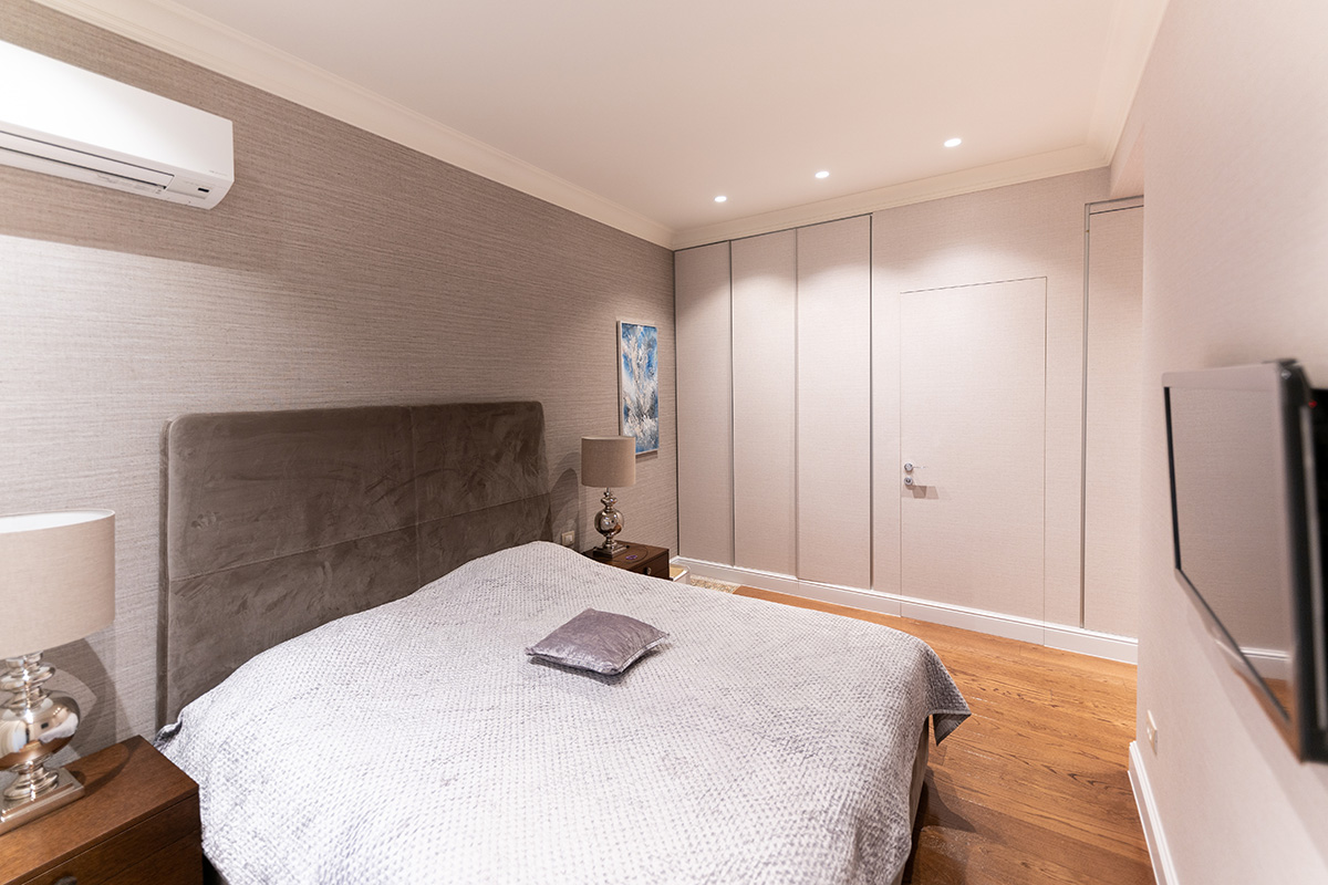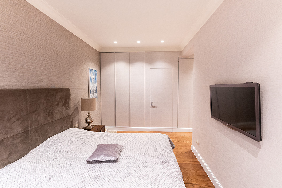 Ova vrata su ugrađena u ravni sa završnom pločom ormara, a preko njih je postavljen tapet – isti onaj koji se nalazi duž čitavog zida sobe. Vrata su se besprekorno uklopila u enterijer spavaće sobe, podržavajući elegantni minimalizam u kom je opremljena ova prostorija.