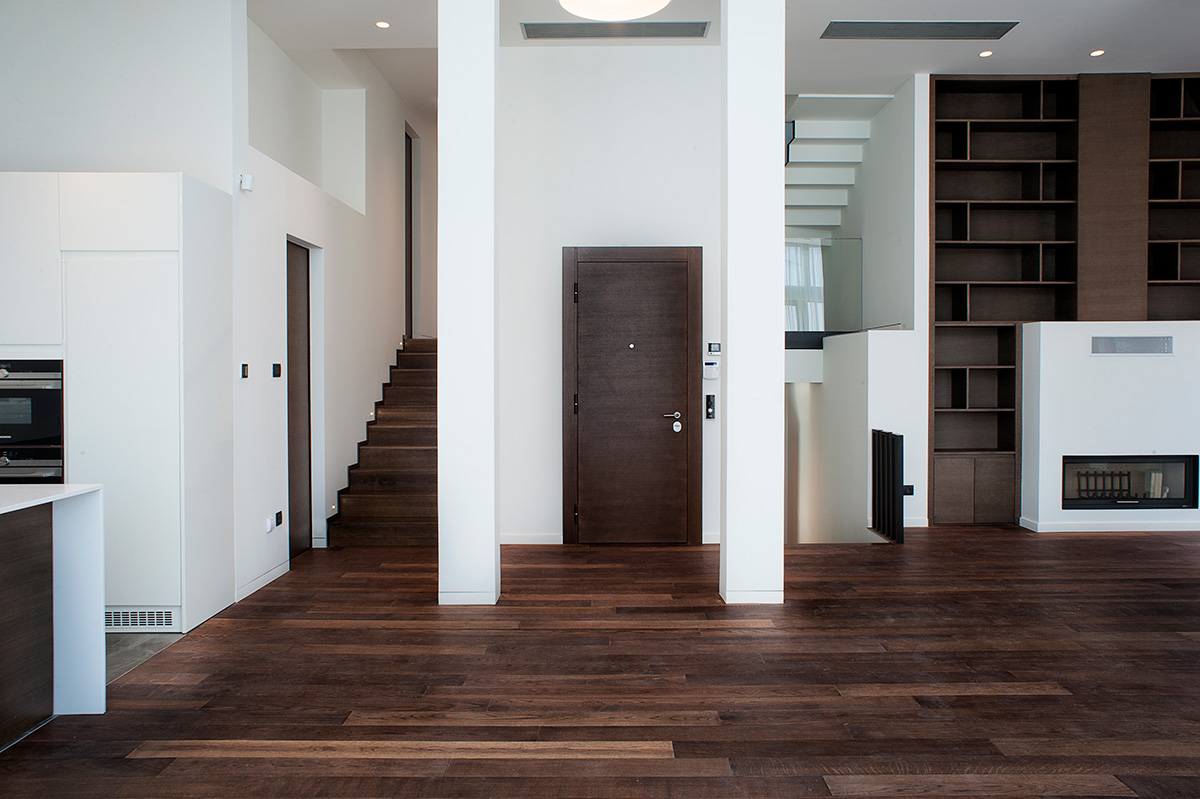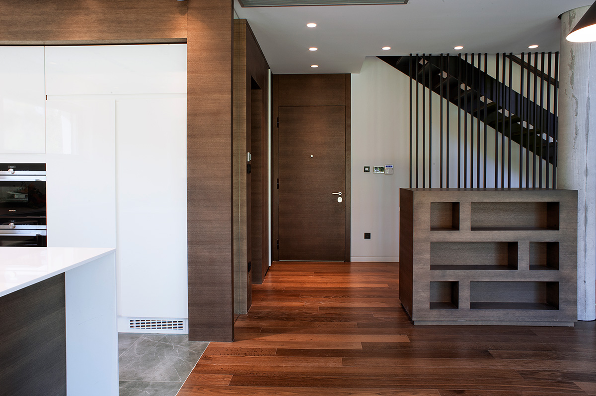Za potrebe ovog nesvakidašnjeg stambenog objekta napravili smo LUX model sigurnosnih vrata, koji ima kompletnu opšivku otvora, u boji hrasta bajcovanoj u tamniju varijantu, kako bi se savršeno uklopila sa svim ostalim elementima u enterijeru.
